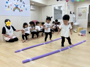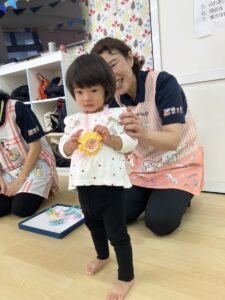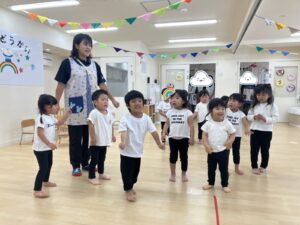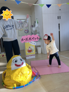 昨日はミニ運動会ありがとうございました。親子で楽しめました。緊張してみんなの前では踊ったりできないんじゃないかと思っていましたが、ダンスも、だるまさんの「びろーん」も楽しそうにできて成長を感じました。みんなの応援?としてお友達の競技中も一緒にだるまさんの動きをしていました。